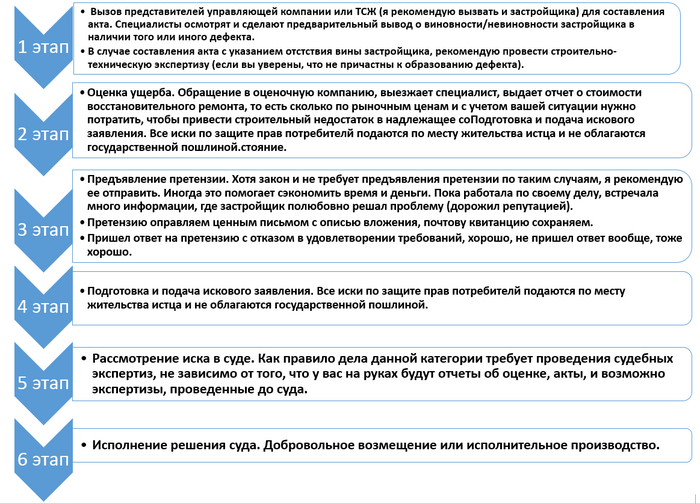 Не смотря на довольно разношерстную практику за 15 лет, я столкнулась с таким делом впервые. И скорее это связано не с отличным качеством новостроек, а простым непониманием, нежеланием и боязнью собственников тягаться со строительными компаниями (они же такие сильные, а я… а что я могу?, я простой человек…).