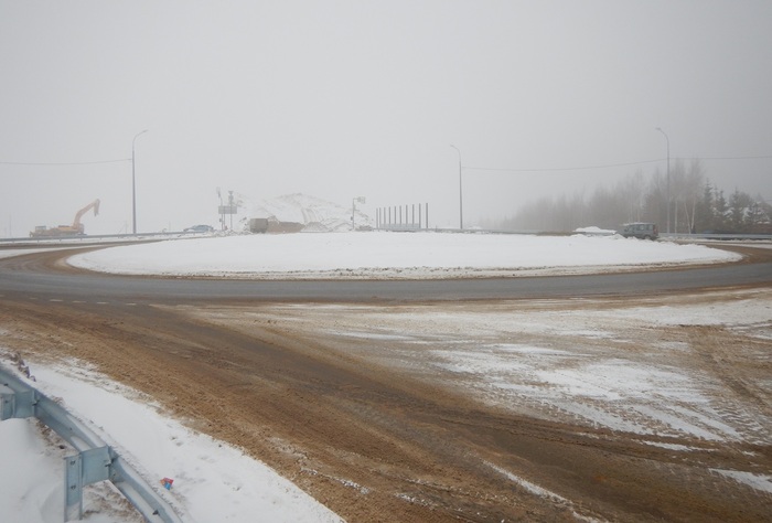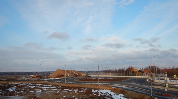Круговая развязка с улицей Загорского. "Прямо" дорога будет продолжена до Новоугличского шоссе. Сейчас "прямо" отвал грунта и работающая техника.