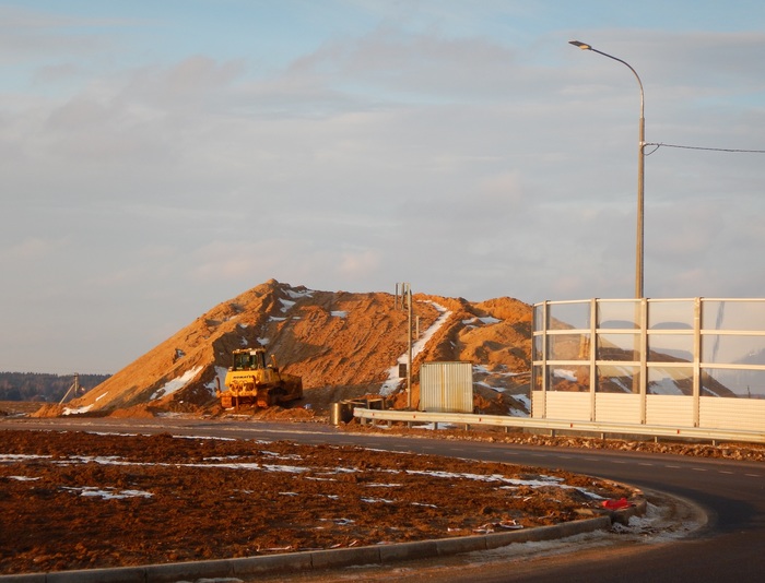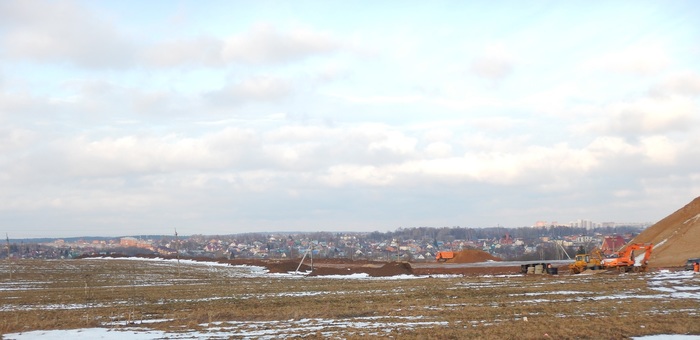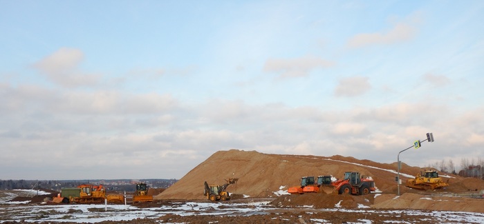 Строительство обхода продолжается - подготовлен песок для насыпи, работает техника.