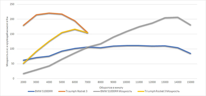 Если мы посмотрим на графики внешних характеристик моторов Рокета и SRR - то видно что в диапазоне до 7000 мотор Рокета уделывает спортбайк, как бог черепаху.