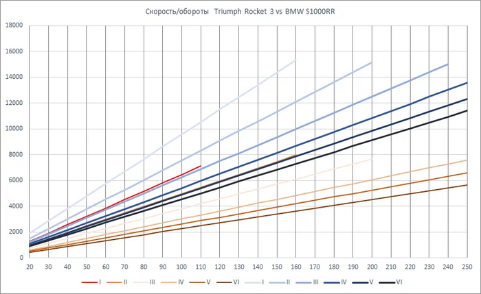 Опять же на трассе, на так скажем "крейсерской" скорости в 150 км/ч Триумф будет ехать на 6 передаче на 3400 об/мин, при этом доступный момент на колесе будет 650 нм и мощность в 110 л.с. , а SRR будет ехать на 6800 об мин и 570 Нм /100 л.с. соответственно и если оба открутят ручку, то без переключения вниз Триумф будет разгоняться бодрее.