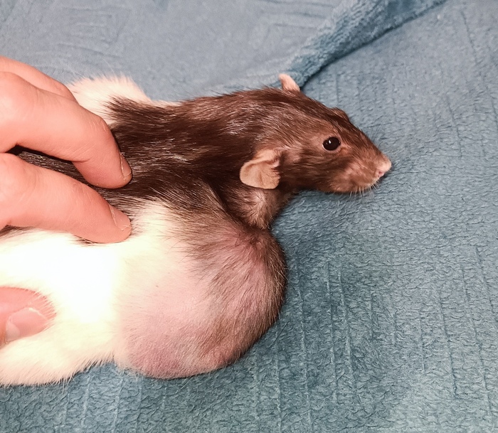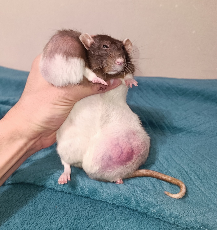 Питомца приобрели в зоомагазине маленьким, девочка, +/- 5 месяцев возраст был. Не прошло и двух недель как она принесла приплод. Дочь (11 лет) испугалась так как была одна, звонит в слезах мол "из питомца какието красные куски выпали". Мы тогда удивились как такая маленькая крыска уже оплодотворена оказалась но судя по всему продавцы не очень следят за этим, отсюда и болезни различные связанные со смешивание однокровок. Отдали в зоомагазин крысят как они подросли, одного оставил себе я. Мы живём раздельно, в разводе, у дочери уже была одна крыска, ей уже 10+ месяцев было когда взяли вторую. Вот таким образом у меня появился питомец а у дочери два. Но вскоре оказалось что младший брат страдает от аллергии и от питомцев понадобилось избавиться, так они переехали ко мне, стало очень весело))) Через года полтора я отдал одну из них, самую первую девушке знакомой, она ей очень понравилась и к тому же у нее уже была краска ранее. О чем очень жалел, уж больно к ним привязываешься,это милейшие создания. Самая взрослая умерла пол года назад, опухоль была + она ее грызла, но сильно не мучилась, бодрячком была, было ей 2.5 года. А это Лола ей сейчас тоже 2.5, одна осталась. Страдает от опухолей, стараюсь максимально комфортные условия обеспечить. Обращаться в ветклинику в таком возрасте крысы (а они живут до 3 лет) лишнее, скорее всего животное погибнет при оперировании. Может кому то будет интересен пост. Те у кого живут крыски с опухолями (часто бывает такое), не отчаивайтесь, проявите больше внимания питомцу если хотите помочь ему и он проживет с комфортом ещё долго.