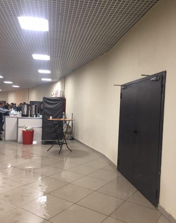 Больше всего воды скопилось в коридоре, который опоясывает стадион. Волонтёры, которые дежурят возле дверей, не смогли объяснить, откуда именно и по каким причинам течёт вода.