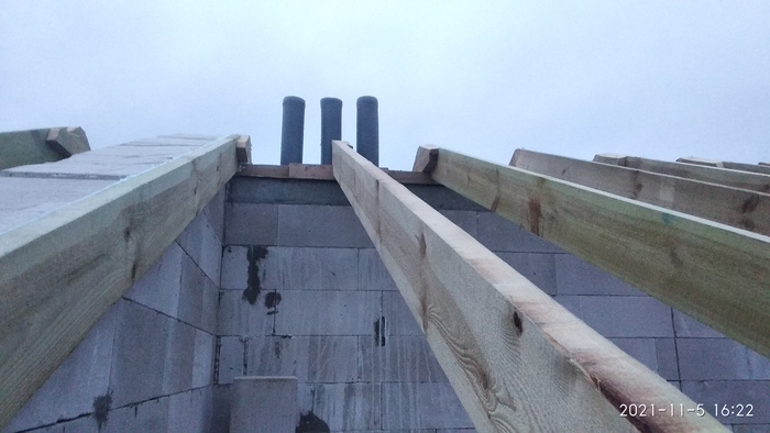В прошлый раз я закончил на стенах, они выстроены, на дворе конец сентября и пришло время для крыши. Сезон дождей не дает как следует разогнаться и крыша несколько затянулась. Проект с которого я скопировал свою избушку, предполагал вальмовую кровлю, но вы же помните что я экономлю на всем, плюс четырехскатная крыша предполагает какого никакого но опыта, а я в стройке "нахватался по верхам". И кстати, отходов от вальмовой кровли дай боже, поэтому волевым усилием меняем крышу на простую двухскатную и строим как могем. Сама конструкция проста до безобразия, я начитался про всякие распоры кровли, поэтому условием строительства была центральная несущая стена, что позволяло: а) положить более короткие плиты перекрытия, б) сделать конструкцию крыши наслонной, без всяких распорных усилий.