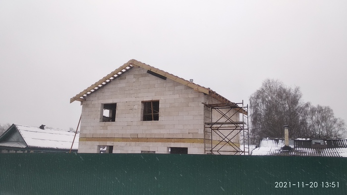 тем временем дожди плавно перешли в снега, а я не приступил к металло черепице, по этому поводу жутко комплексовал, пленку то нежелательно оставлять не накрытой, да и снежная нагрузка ей не на пользу, поэтому собираем яица в кулак, зовем подмогу и накрываем металло черепицу.