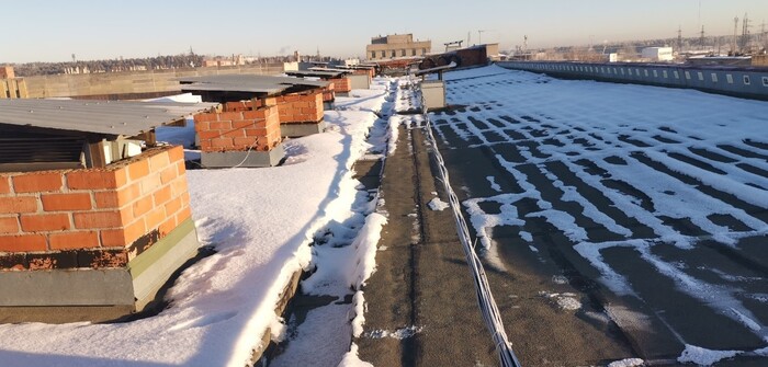 А теперь к делу. Рассматриваемый объект - каркасное здание, в рамках которого был достроен мансардный этаж. Кровля выполнена плоской из битумных наплавляемых материалов с организованными водостоками. На момент обследования дефектов, в виде разрывов полотна кровли или иных дефектов не обнаружено.