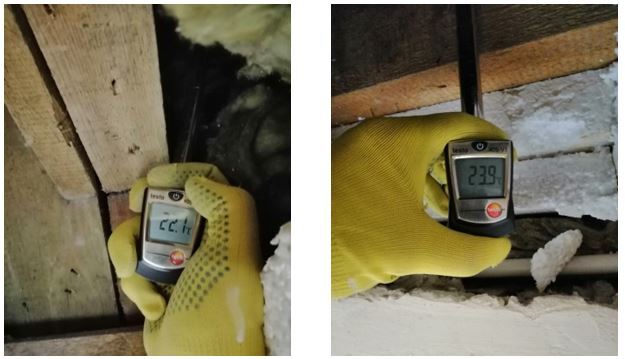 При обследовании конструкций экспертом проведены фактические измерения движения воздушных масс в неэксплуатируемом пространстве кровли при помощи testo 605-H1 - Термогигрометр стик-класса, в результате чего установлено, что пространство хорошо проветривается и движения воздуха составляет 0,20-0,33 м/с (см. фото ниже). Но также зафиксированы положительные температуры в пространстве кровли в диапазоне 22-24°С.