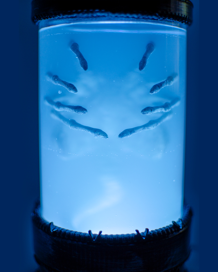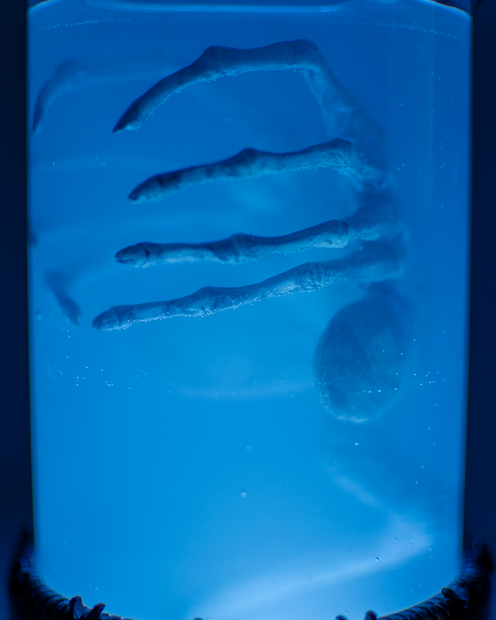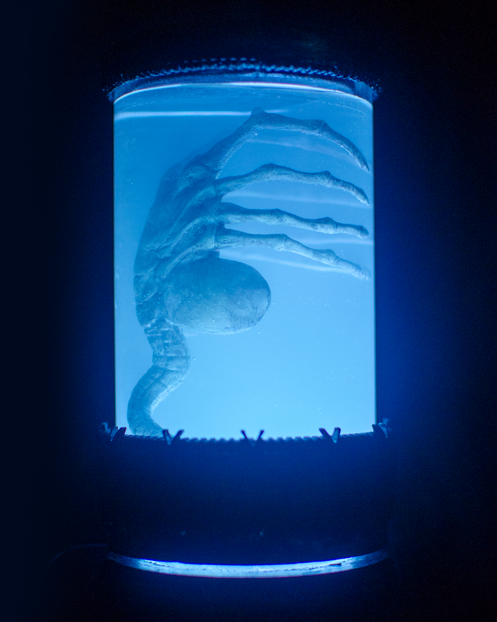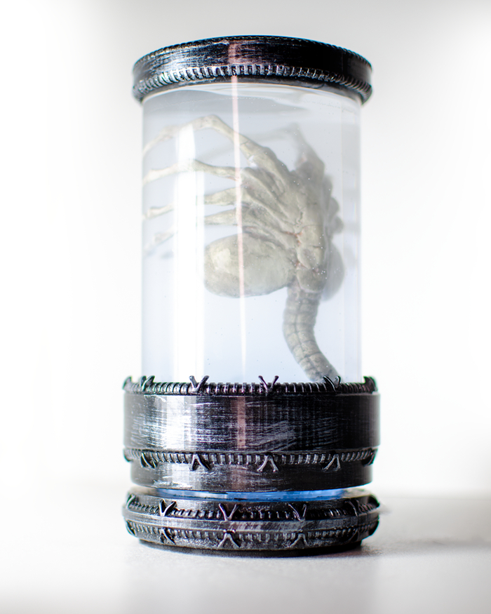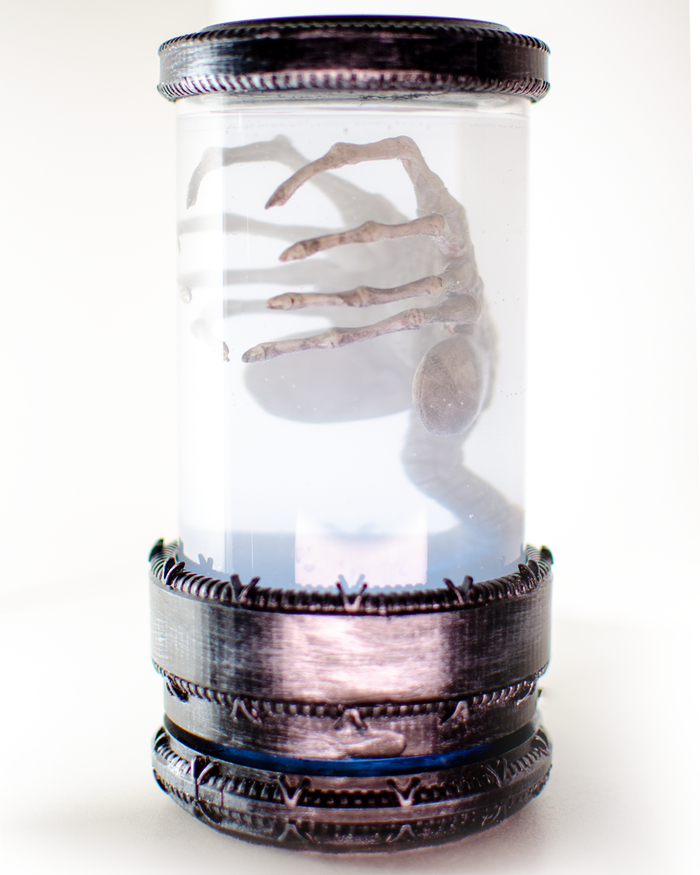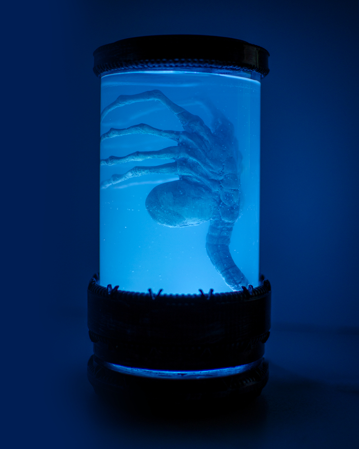 Увидел где в интернетах и решил повторить. Колбу сделал из банки для хранения сыпучих продуктов, подсветка из фонарика для ванной (он на батарейках, но я его переделал на блок питания), все остальное 3д печать