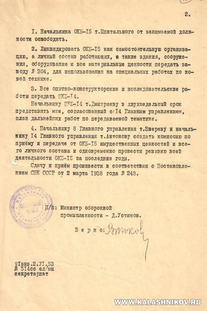 Изображение приказа Министра оборонной промышленности СССР Д.Ф, Устинова № 224сс от 14 мая 1953 года о ликвидации ОКБ-16