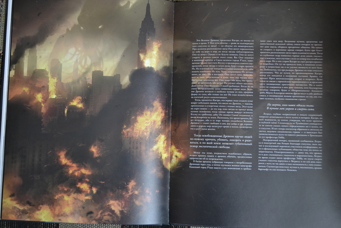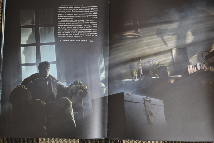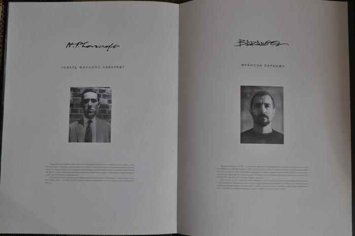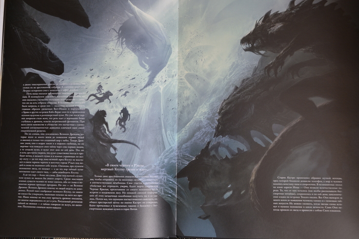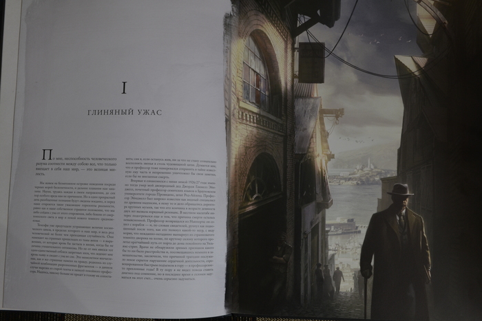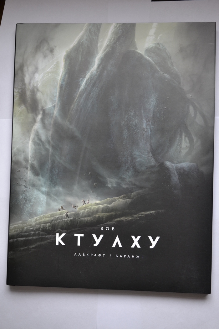 Увидел эту книгу в Буквоеде. Довольно любопытное издание, сразу попалось на глаза. Всего в этой серии три книги: Зов Ктулху и два тома Хребтов безумия. Я сначала Хребты и хотел приобрести, но когда увидел, что этот рассказ разбит на два тома (второй стоит в два раза дороже, хотя объем один и тот же), то резко передумал. Увеличенный формат (А3!). Большую часть страниц занимают иллюстрации. Немного почитал, посмотрел картинку, проникся, перелистывай дальше. Можно, наверное, даже назвать эту книгу артбуком. Иллюстрировал книги Франсуа Баранже, об этом написано на каждой странице, чтобы мы не дай бог не забыли. Но иллюстрации, надо отдать должное хорошие, рассматривать их интересно, дух рассказов они передают. Ну и немного критики. Все-таки формат, на мой взгляд, слишком уж огромный. Эта книга теперь самая большая в моём доме и не влезает ни на одну полку. При таком размере текст слишком мелкий, просто на грани комфортного чтения. Я, конечно, понимаю, что здесь Баранже главный, но и к читателю надо чуть больше уважения, ведь без текста это просто красивые картинки.