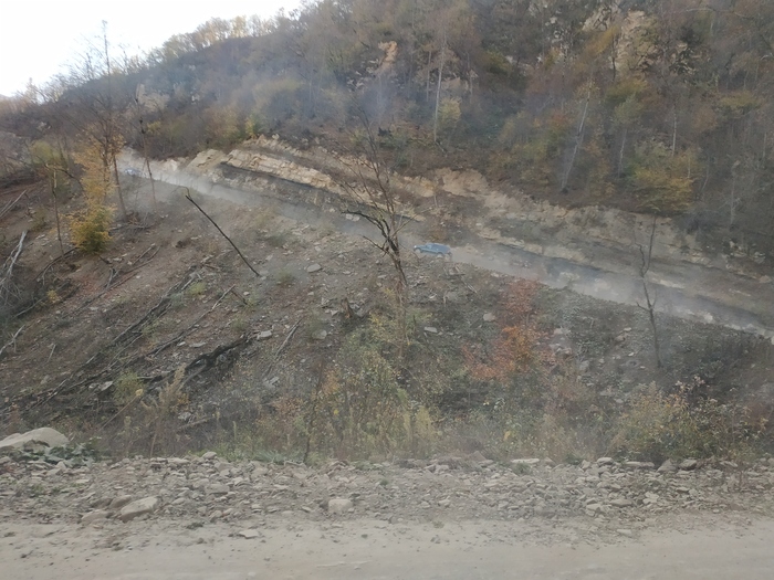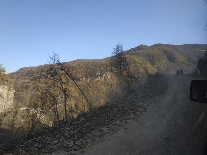 слева отвесные скалы, справа это не кусты это верхушки деревьев. Все покрыто толстенным слоем пыли.