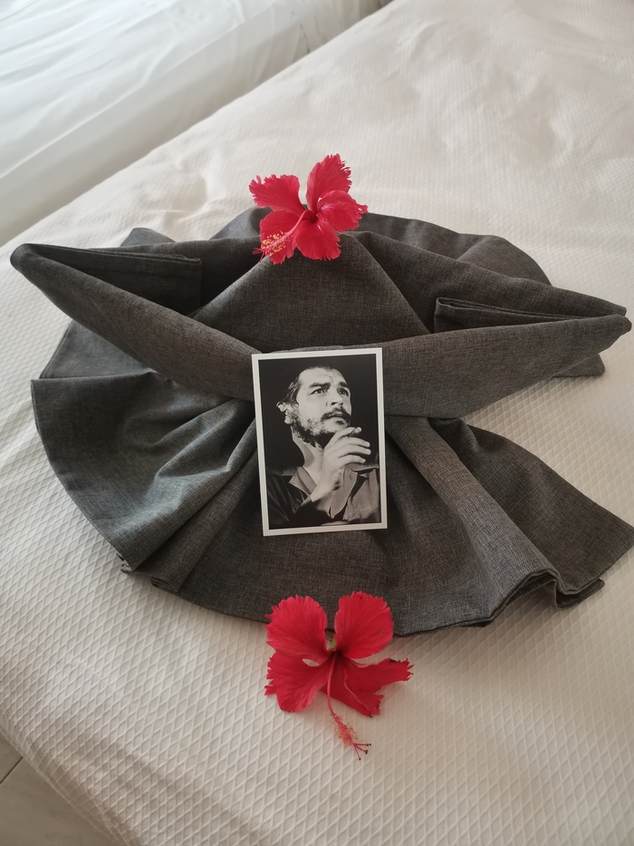 Я просто обожала эту игру! Оставляла подарки и послания горничным и когда возвращалась с пляжа в номер меня ждал полотенечный шедевр с живыми цветами и открытками с Че. Больше всего моя горничная любила капроновые колготки 20 DEN.