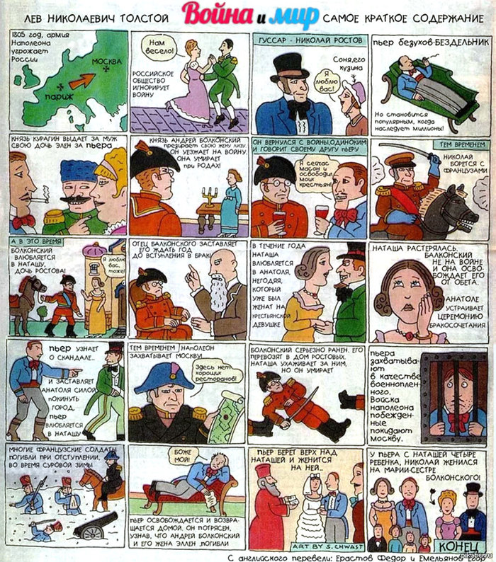 Понятное дело, что когда в школе проходили «Войну и мир», девочки дружно пропускали страницы с описаниями военных сражений, – про «любофф»-то всяко интереснее. Да и сейчас у «лонгридов» в духе Толстого не много шансов быть прочитанными современным поколением. А зачем, когда все четыре тома можно уместить на листочке комикса. Например, вот так: