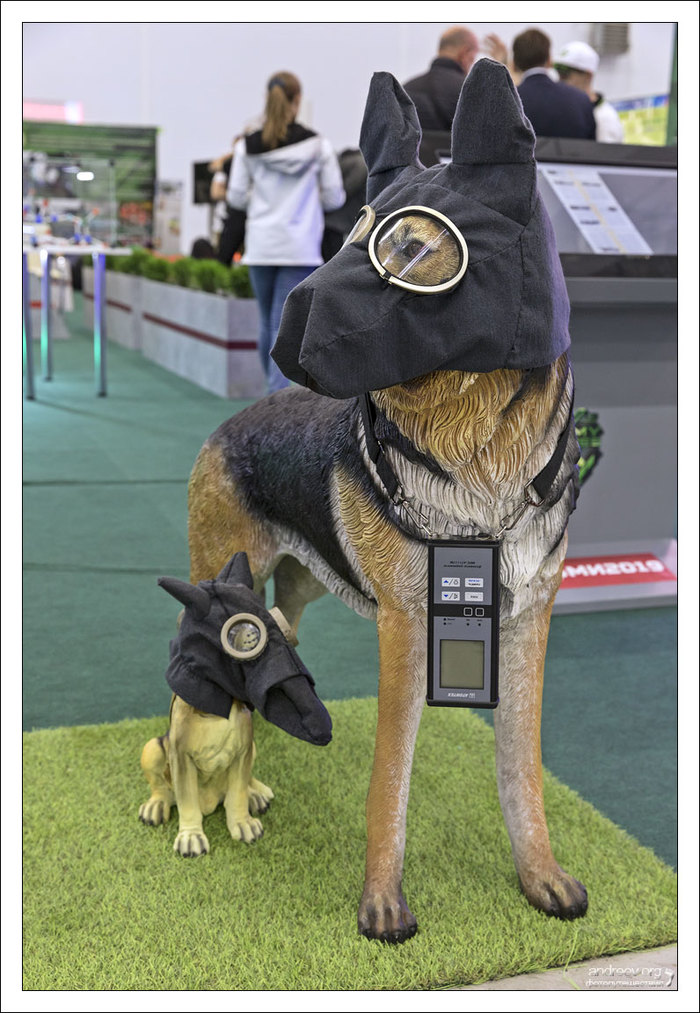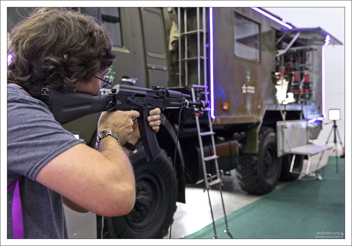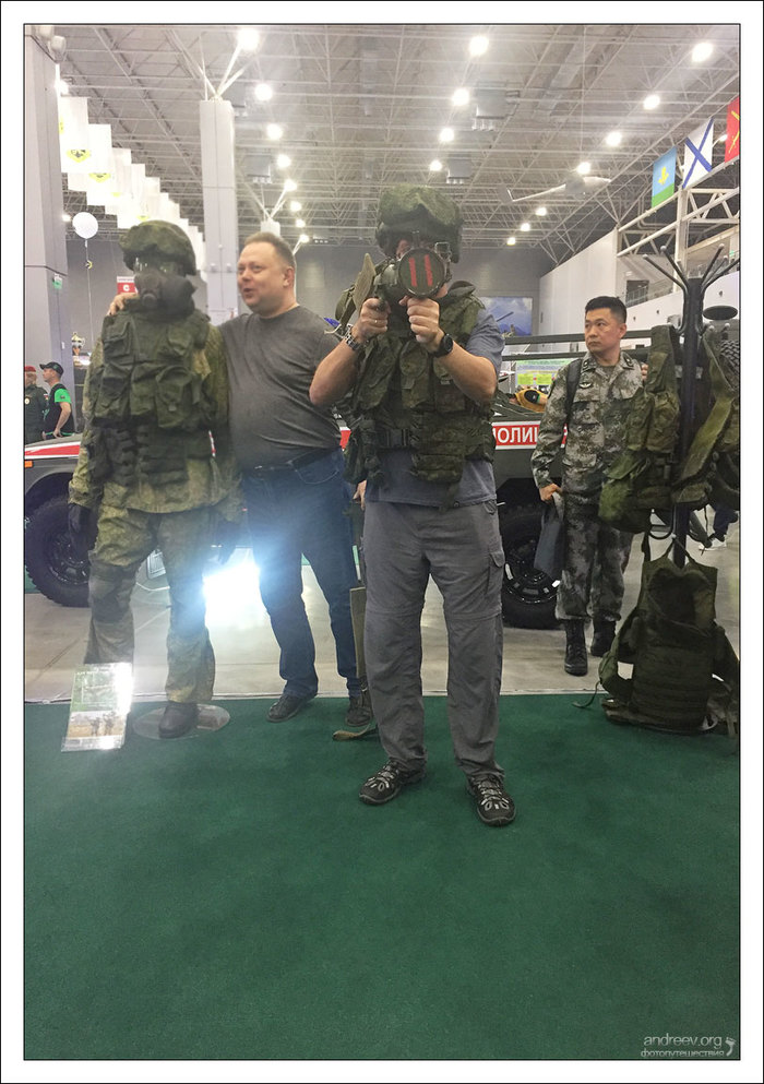 Но самое интересно было внутри экспо-центра. Пока на экранах показывали финал биатлона, мы обошли все выставки. Оружейный прилавок – разбирай/собирай в свое удовольствие; заминированный участок – полоса песка, дают в руки металлоискатель и одевают в спец. обмундирование (тяжелое, зараза, 18 кг!); «прикид» огнеметчика и водолаза.