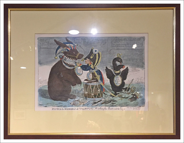 Обоюдные почести в Тильзите, или Мартышка, Медведь, и Орел. Раскрашенная гравюра Уокера. Англия, 1807 г.