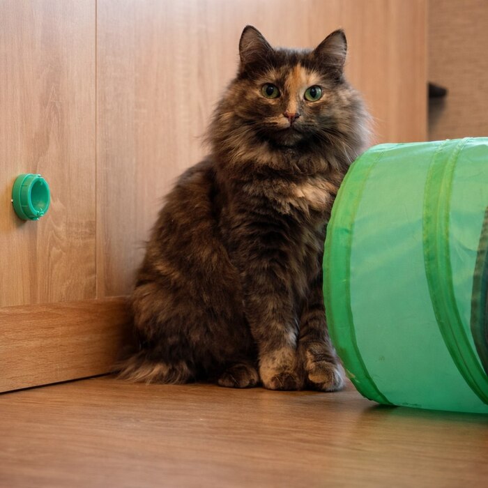 Мы зовём её Тиффани, ей около года, она ласковая девочка, которая любит сворачиваться в клубок рядом с человеком и тихонько урчать.