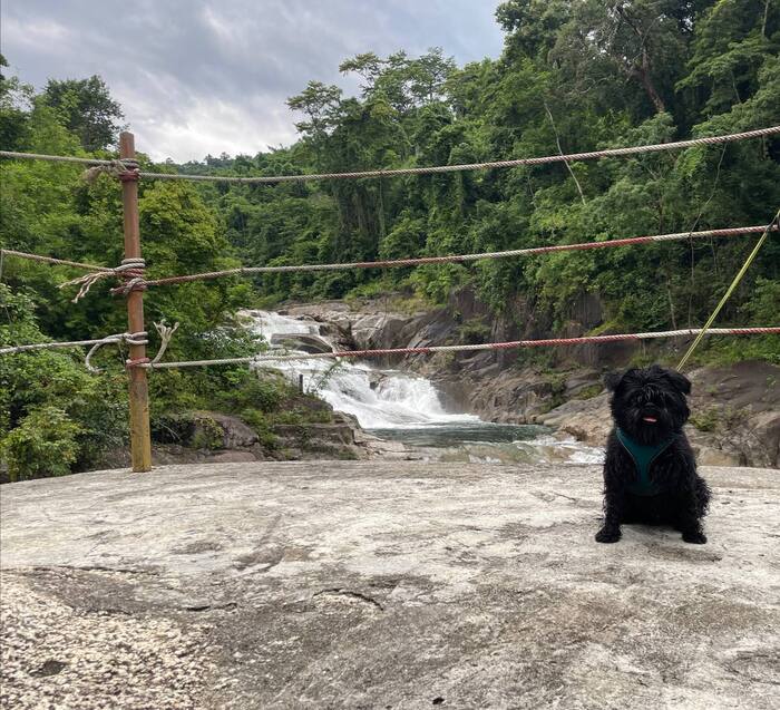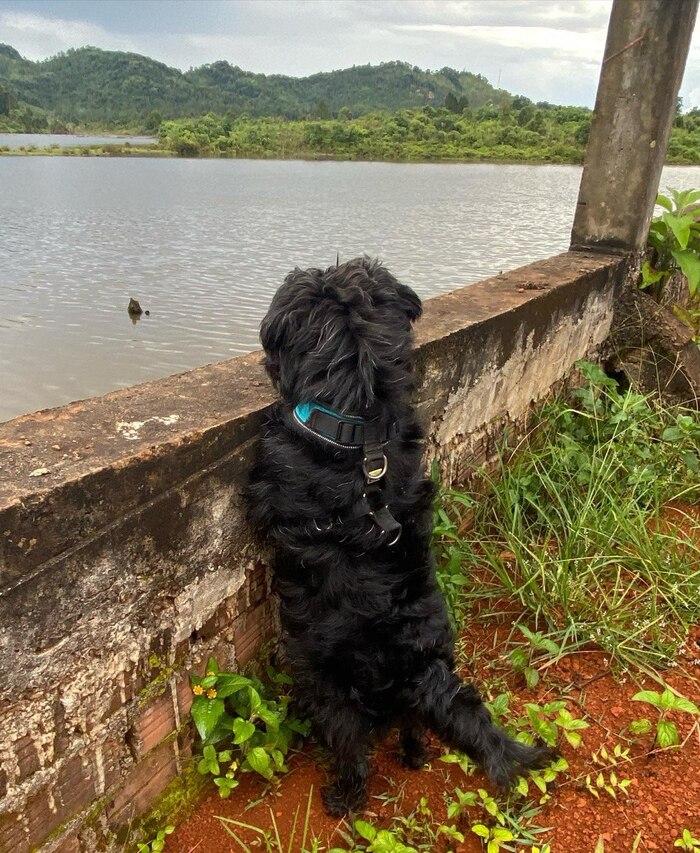 «Наш шестилетний аффенпинчер Вуки — уже закалённый путешественник. В России он побывал в Сочи, Карелии и Питере, а после покорял мир: Турцию, Сербию, Лаос и Вьетнам. Катался на мопеде, купался в бассейне с лотосами, в море и под водопадами, даже задерживал дыхание под водой — ради погони за пузырьками воздуха.