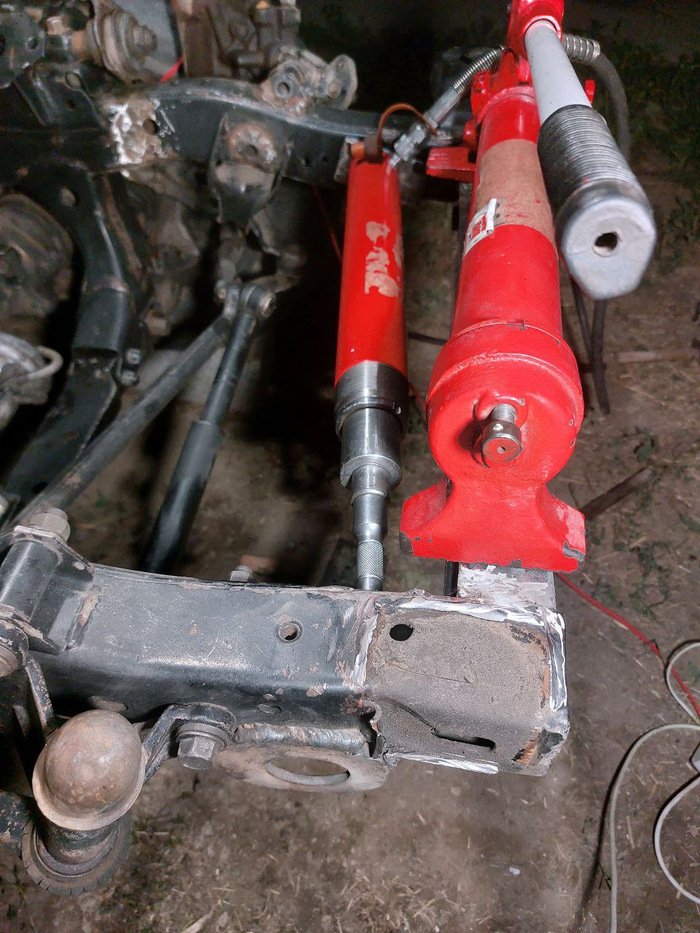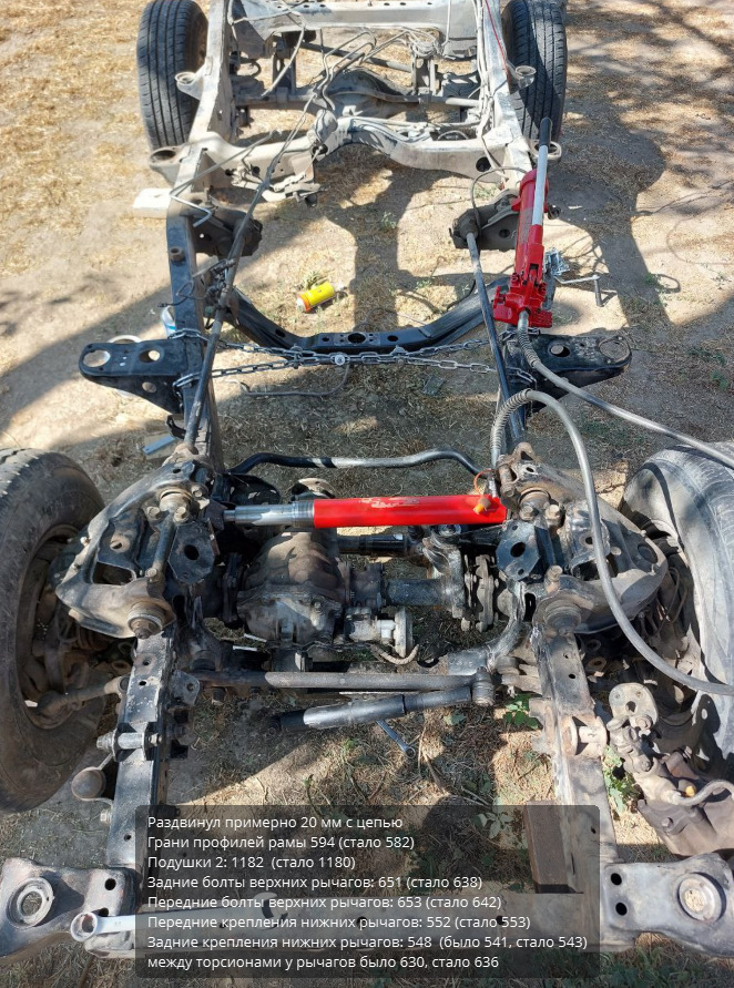 Но это лишь середина пути. Теперь нужно выравнивать раму по центру, избавиться от ухода влево. Для этого гидравлический распор ставлю по диагонали в разных точках рамы, и рама понемногу выравнивается.