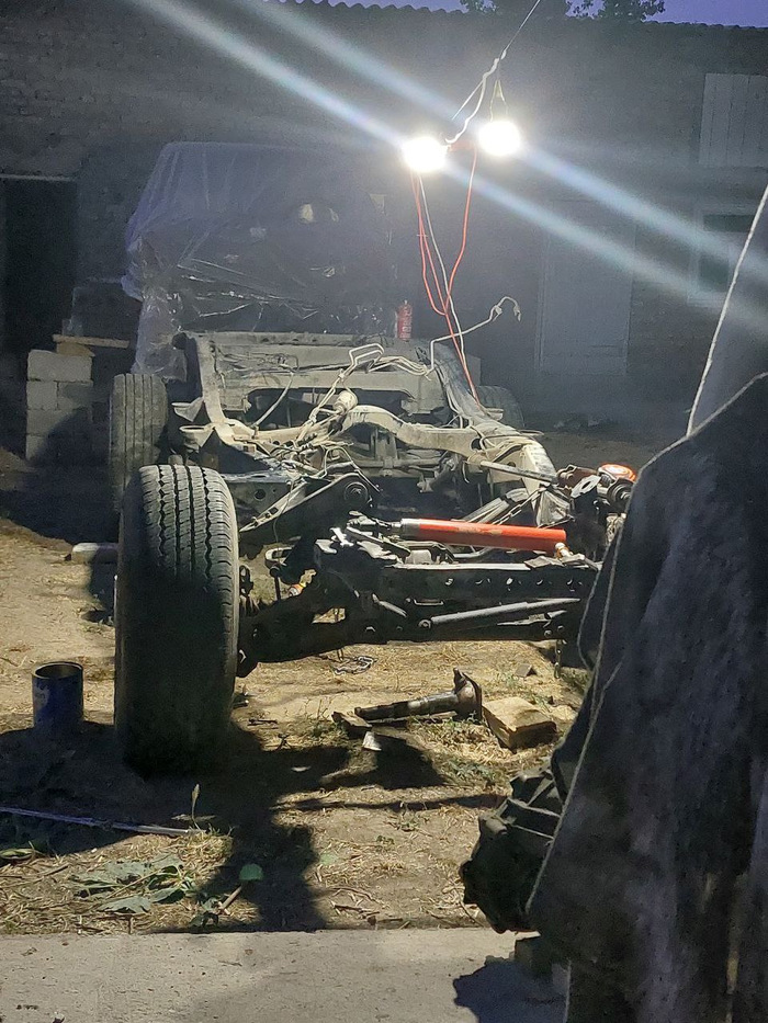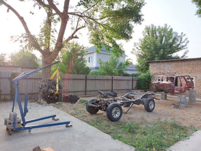 Ну что же, будем делать. Подъемника у меня нет, конструировать турник на один раз нерентабельно, решил поставить кузов на шлакоблоки и выкатить раму: