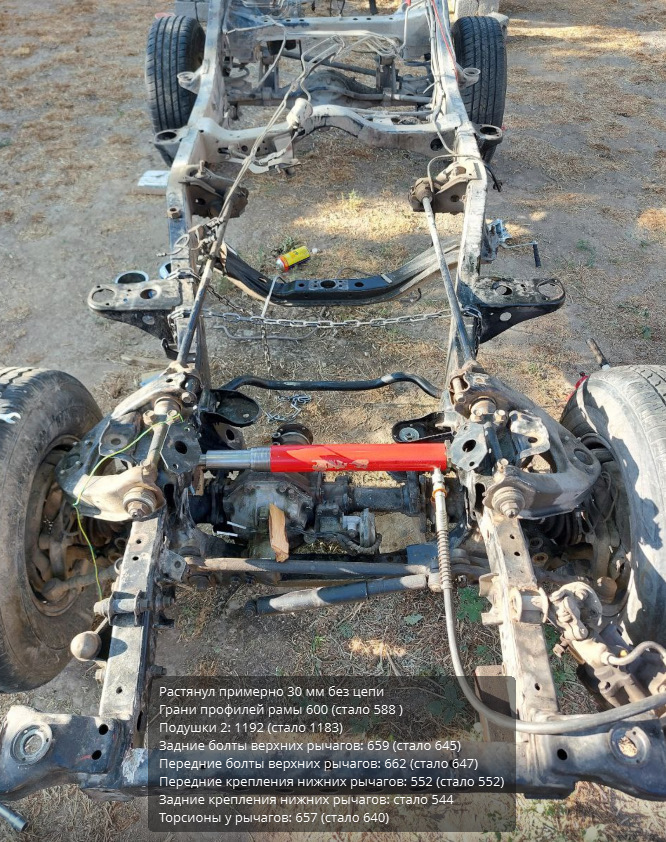 Мне не нравилось, как выглядели подушки двигателя. Они конечно изношенные, но и с их размещением что-то не то. Быстрый обмер вокруг двигателя показал то, что рама уже чем должна быть по контрольным точкам на 10 мм. Сплюснута в районе верхних рычагов и крепления двигателя. Позже я узнал что это особенность износа рам 130 кузова.
