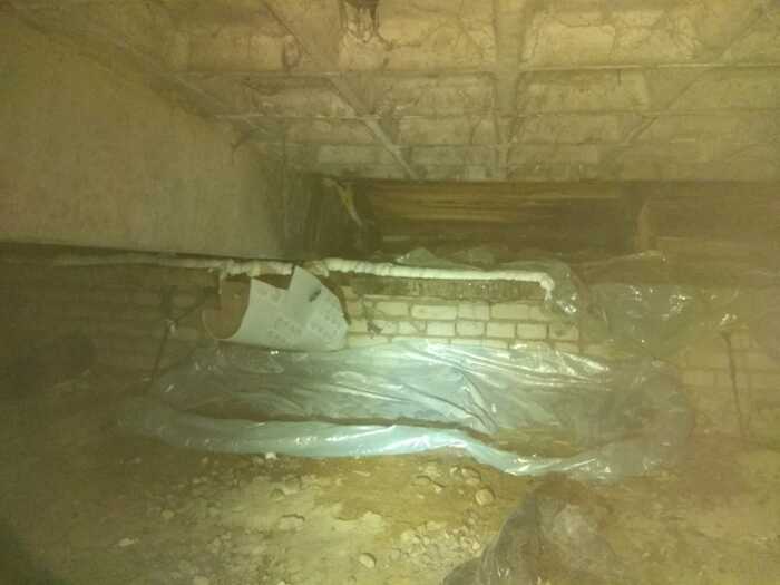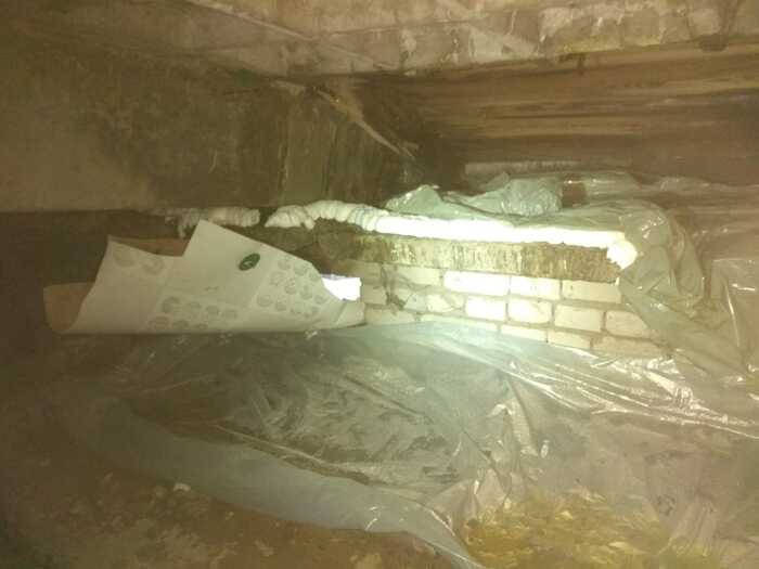 Вместо ремонта, сотрудники УК положили пленку и поставили емкости для сбора воды, из линолеума сделали импровизированный водосточный желоб и заправили их в вент. отверстия.