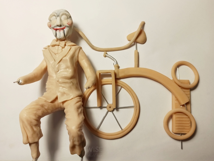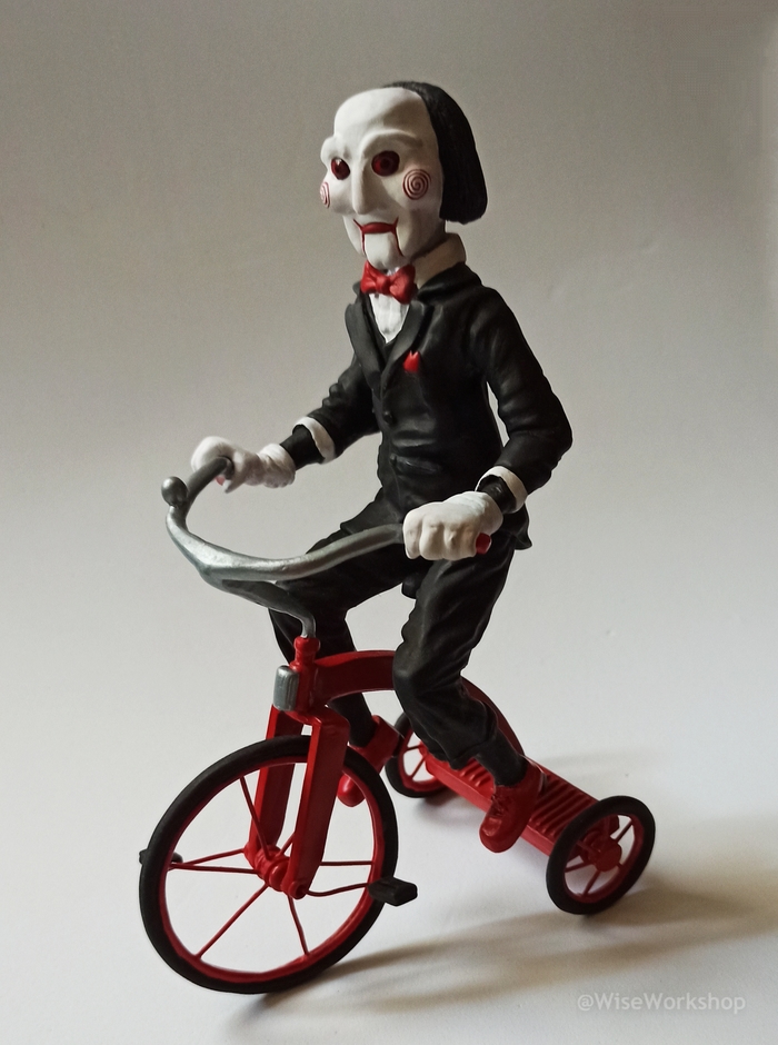Кукла Билли на велосипеде из полимерной глины из серии фильмов "Пила"