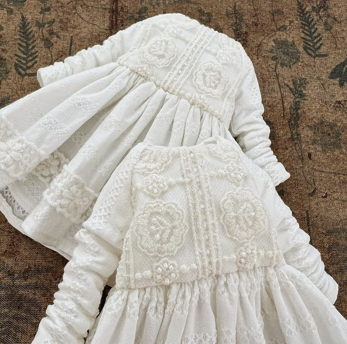 Материалы для нарядов: хлопок, кружева, мулине DMC и Madeira для вышивки и немножечко бисера.