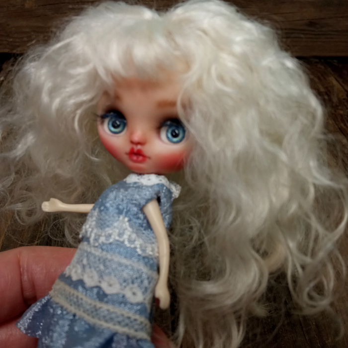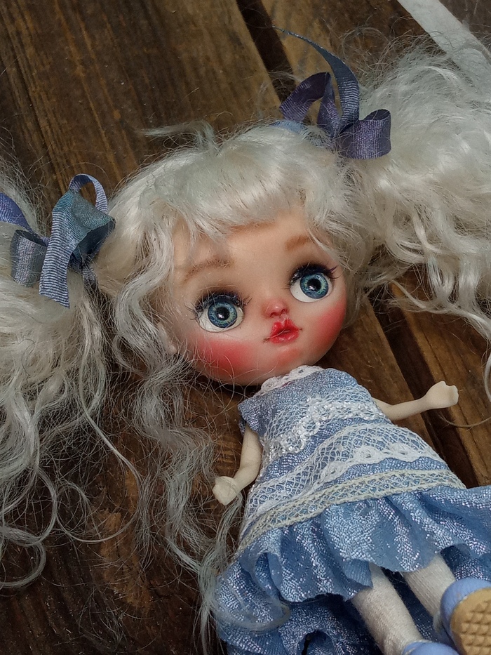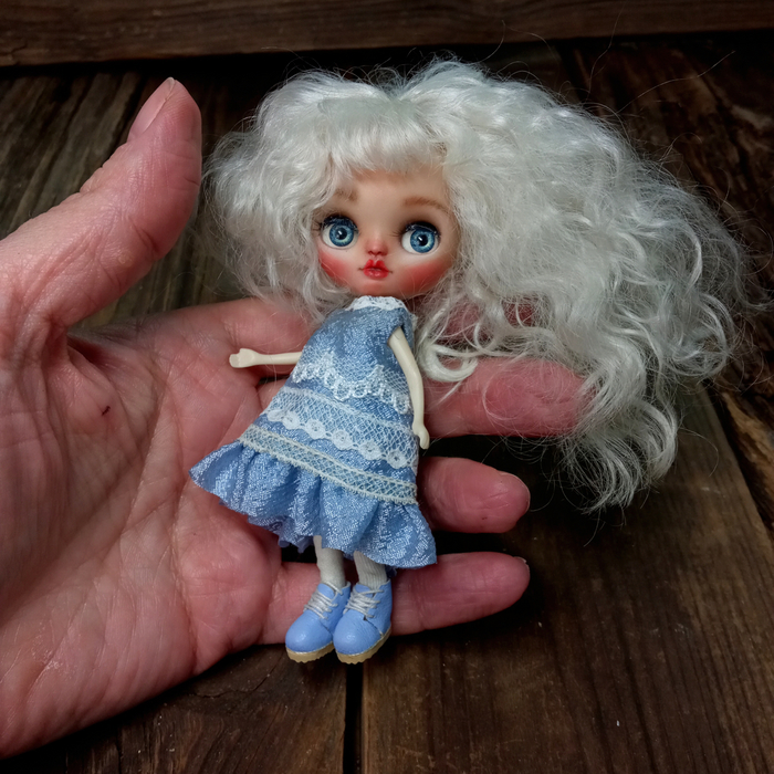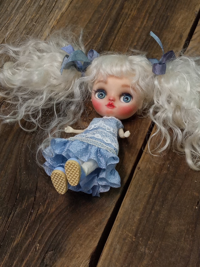 Это переделка куклы с целью сделать ее индивидуальной, неповторимой и симпатичной на своей лад) Петит Блайз (англ. Petite Blythe) - как бы тоже Блайз, только маленькая, всего 10 см. Они появились в 2002 году. Я переделала заводскую куколку, с помощью фрезы сделала ей другое личико, поменяла глаза, сделала прошивку волос, теперь она блондинка и ее можно аккуратно расчесывать и делать прически. Сшила ей платье и купила маленькие ботиночки. Макияж сделан пастелью и закреплен специальным японским лаком, он называется клир, совершенно невидим и предохраняет роспись от уф лучей и от прикосновений людских пальчиков) На последнем фото, куколка до переделки