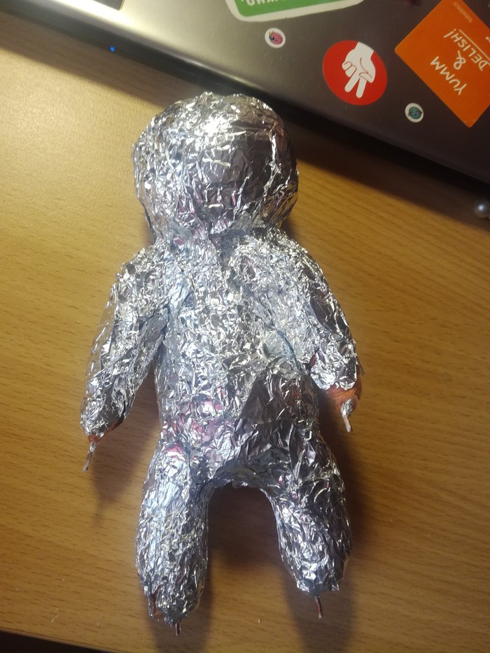 Сделала каркас из проволоки, добавила туды фольгу, обматала нитками для объема... и снова добавила фольгу.