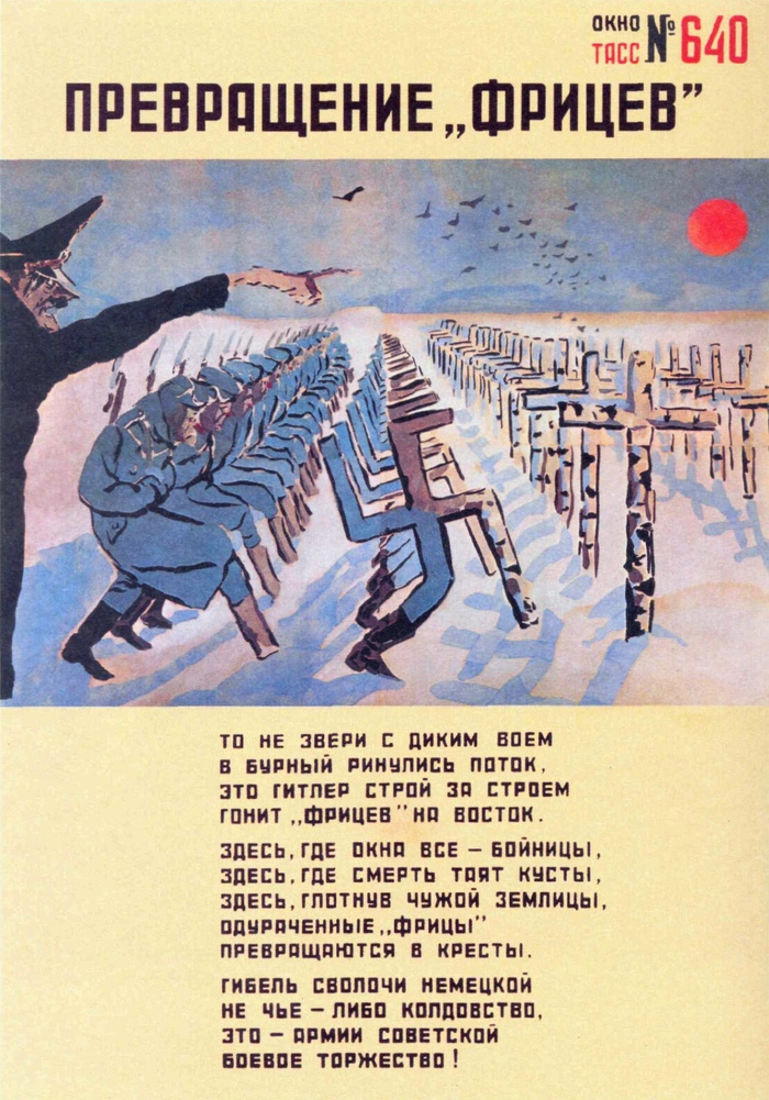 «Превращение фрицев» - плакат наглядно показывает, какими станут непобедимые шеренги "фрицев", идущие на восток.