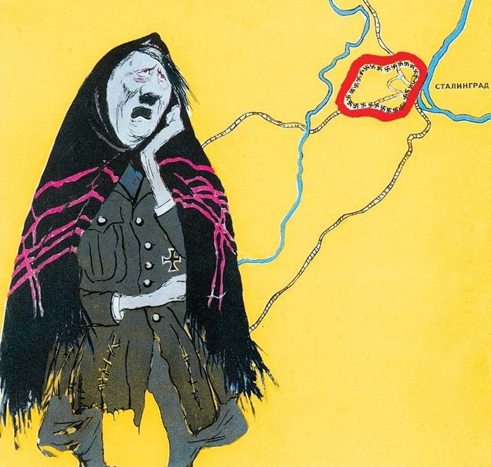 «Потеряла я колечко…» - Гитлер в виде скорбящей женщины с платком на голове горюет о потере группы войск Паулюса под Сталинградом.
