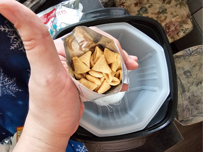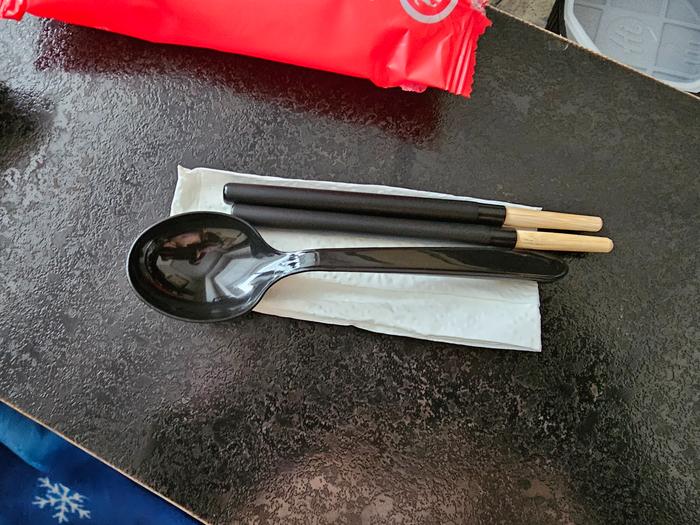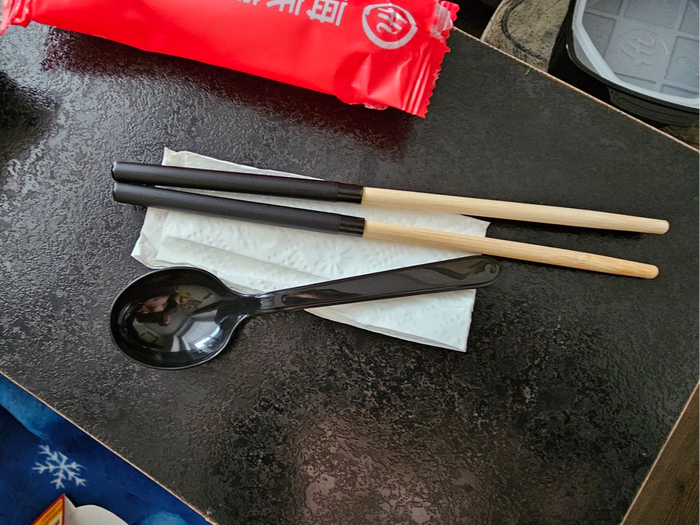 Первым делом вскрываю пакетик с приборами и нахожу внутри неплохую ложку, складные хащи и салфетку. Хащи кстати бамбуковые, что очень даже хорошо!