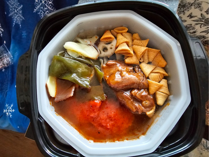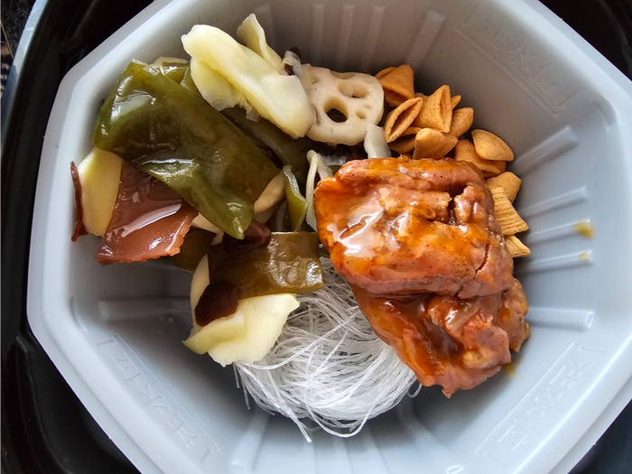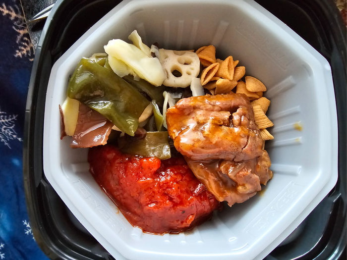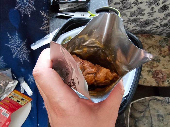 Далее на очереди тушеное мясо. Вроде должна быть говядина, но на запах слегка пахнет соей. Или это у неё соус такой? В общем, дальше на вкус посмотрим.