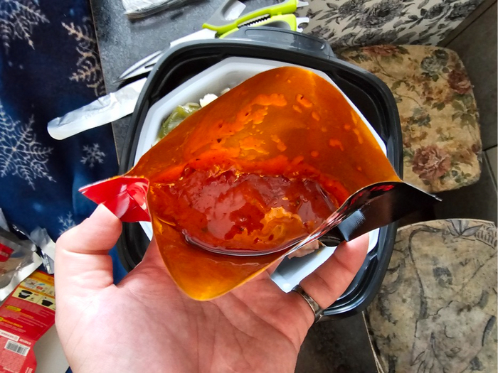 Далее соус. Он оказался совсем не острым. Ну разве что совсем чуть чуть.