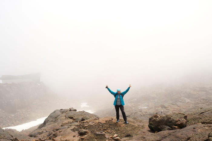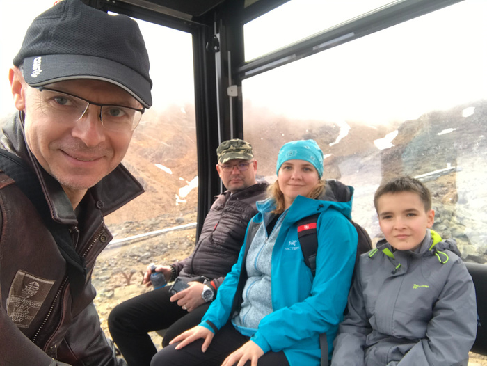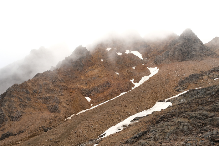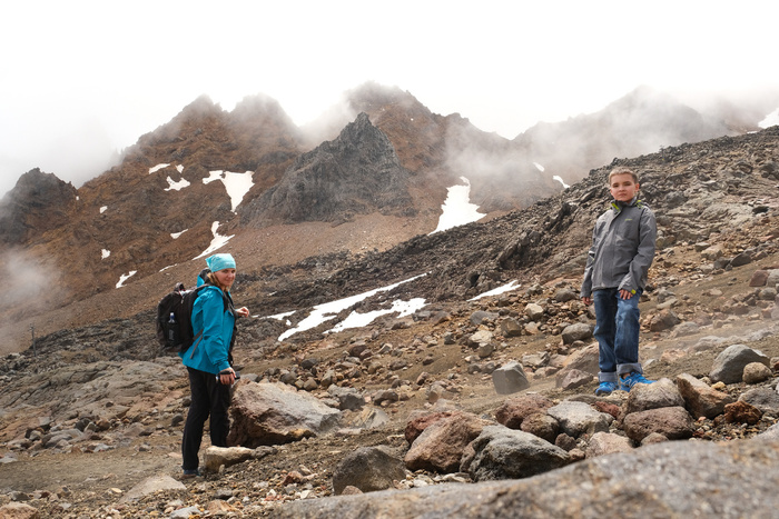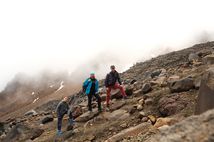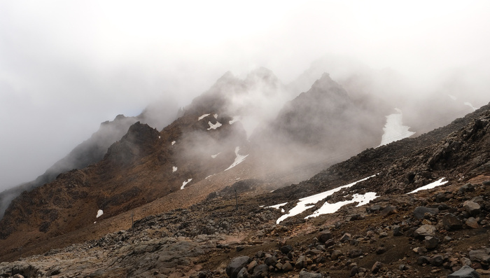 Плотный туман окутал коричневые скалы. Под ногами мелкие и крупные камни, островки влажного снега. Мы не заметили, как оторвались от небольших стаек туристов и оказались в вулканическом безмолвии совсем одни. Небольшими колышками была размечена какая-то туристическая тропа. Очень хотелось пройти по ней, но все трекинговое снаряжение мы оставили в машине. Да и ничего про эти места не читали – какой трек, куда, на сколько часов, можно ли по нему идти в это время года… Как-то ясно представилась новости в местных СМИ: «Семья из России пропала на склонах вулкана Руапеху» или «Плотный туман мешает поисковой операции туристов на Руапеху». Решили не искушать судьбу и повернули обратно.