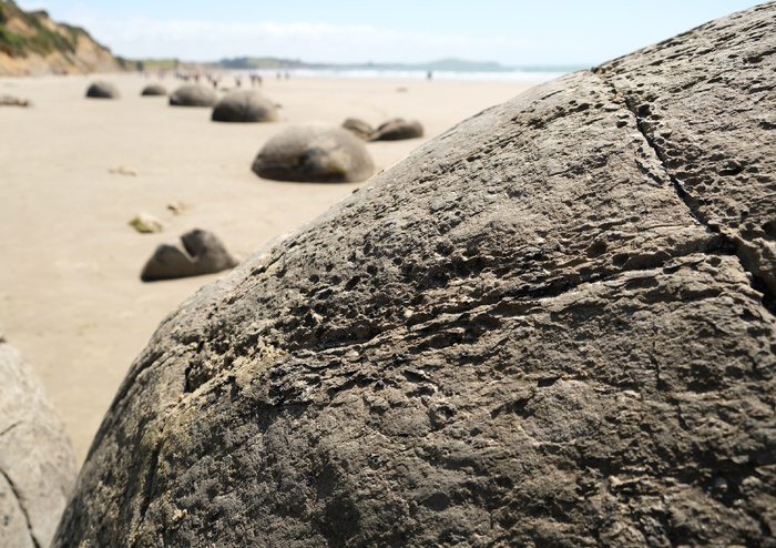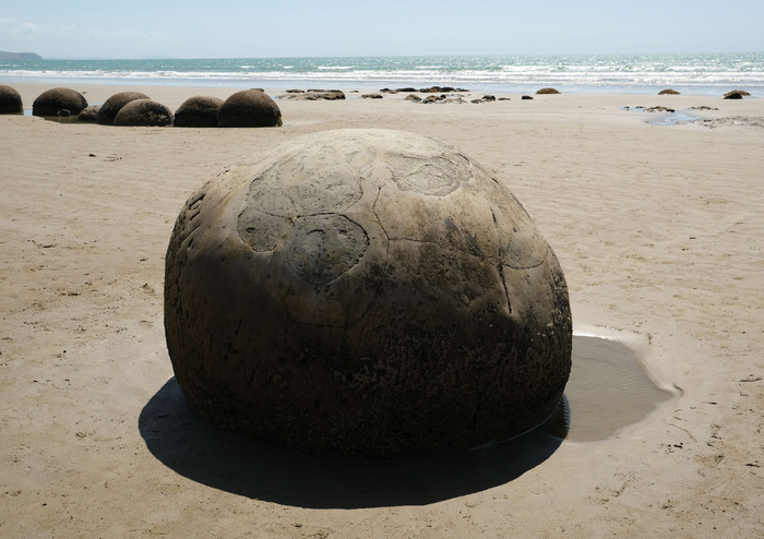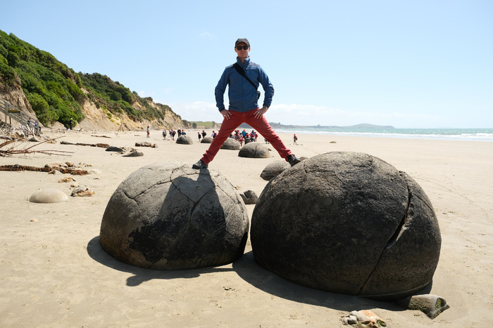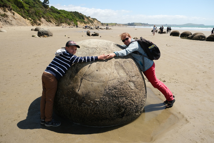 После фермы заскочили на пляж Моераки с его огромными валунами. Несколько десятков больших шарообразных камней торчат из песка, словно их расположил какой-то дизайнер-великан в поисках идеальной композиции. Валуны щербаты, напоминают лунные кратеры и трещины, некоторые похожи на панцирь черепахи. Пейзаж с ними выглядит инопланетным. Они абсолютно круглые, некоторые цельные, некоторые расколоты. На них можно лечь животом или, если подсадят, залезть. Миллионы лет потребовались для того, чтобы из маленьких комков ила и песка на дне морском выросли эти загадочные гиганты и вышли на берег.