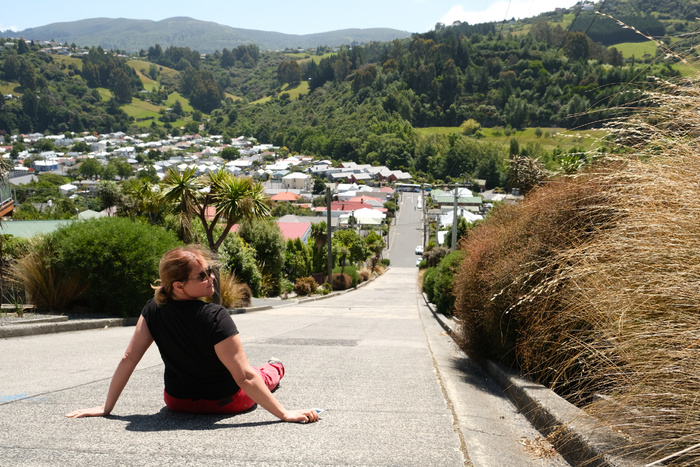 Друзья мои, цифры – ничто, реальность – все. Мы пошли пешком по улице: колени на эти 19 градусов вскидываешь, что твой жираф. Домики по бокам стоят смешные: крыши ровные, второй этаж отличный, а первый начинается от нуля, затем по рельефу расширяется и к другому концу становится полноценным, с окошками. Мы уселись прямо посереди дороги полюбоваться панорамой города, раскинувшегося перед нами. Ощущение – плюхнулся наверху большой детской горки. Я бы зимой ее там и устраивала, ей-богу: заливала бы водой, пусть застывает. Если, конечно, новозеландские зимы это позволят.