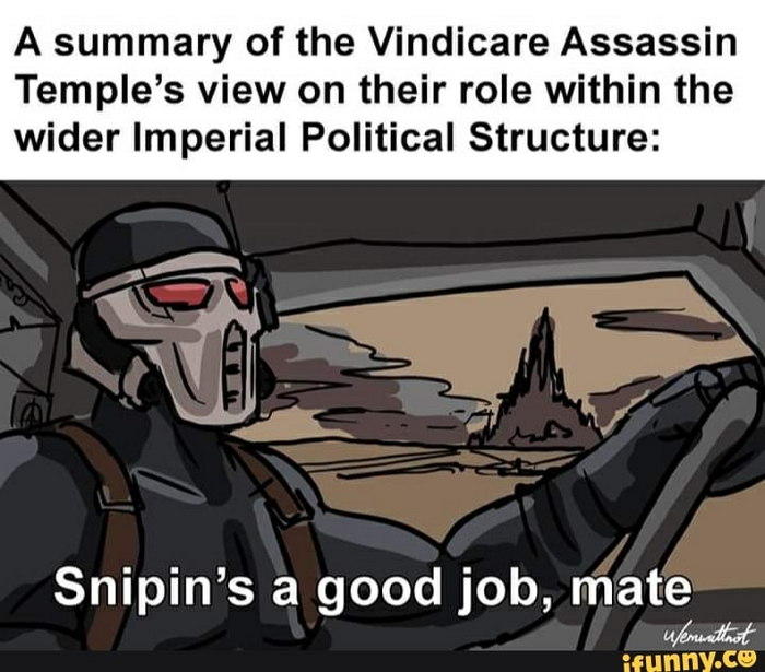 Ванусы редко действуют в одиночку, чаще выступая аналитиками, координаторами и разведчиками для ассасинов других храмов или иных структур Империума человечества. Норм, в целом ребята. Я как то раз пил с таким пиво, он мне столько историй охуительных рассказал, что ёбнешься.