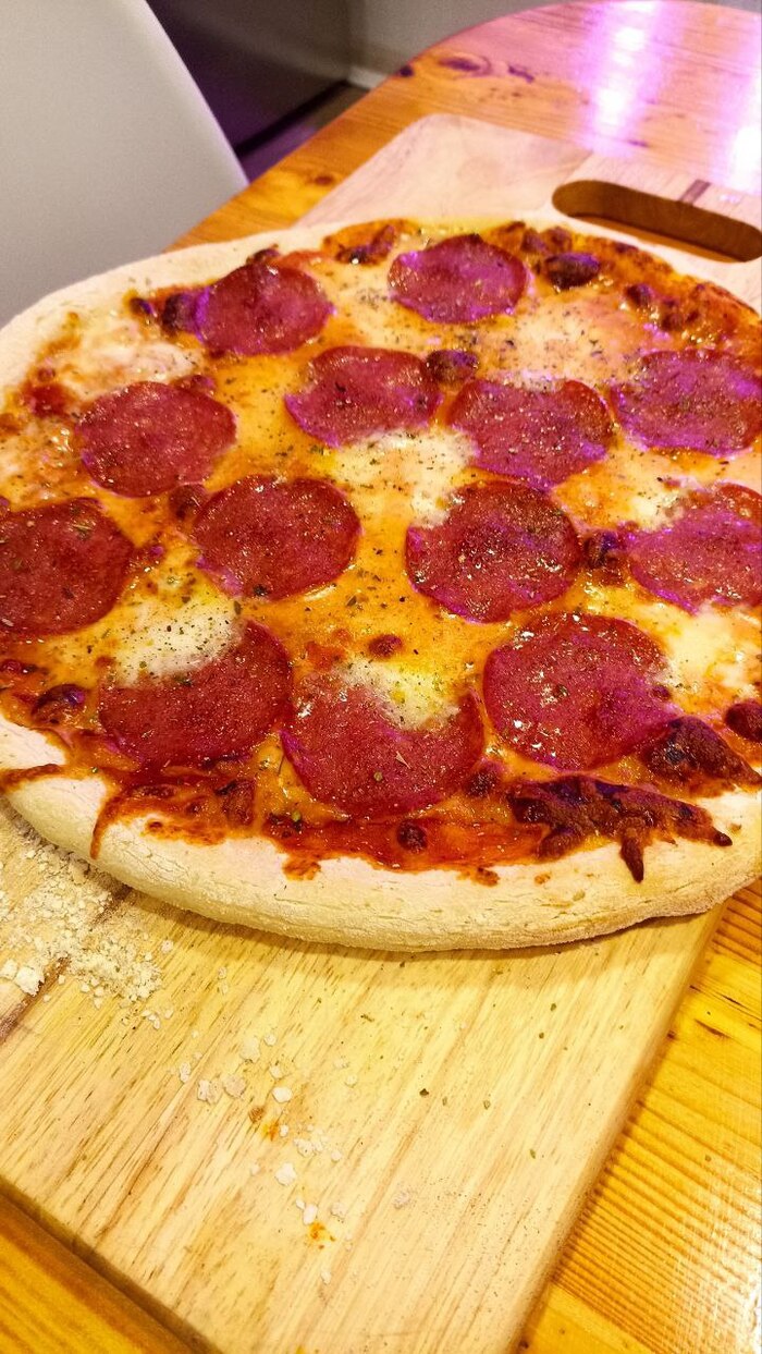 Сбрызгиваем оливычем по желанию ( у меня желания не возникло, и так нажористо) и в печь на 5-8 минут в зависимости от температуры. Моя электричка от БЕКО держит 300+-, там пицца на камне готовится 6 минут