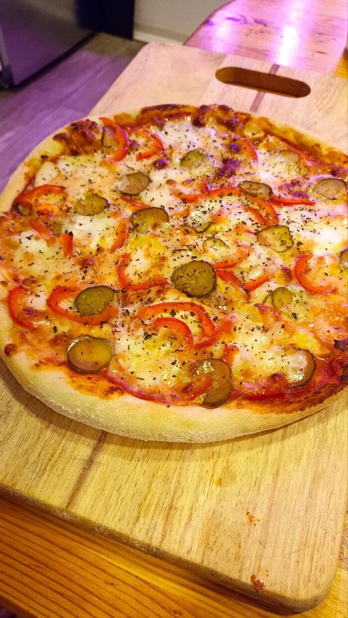 У меня 3 вида пиццы - а-ля пеперони (не острая), грибная со сливочным соусом, и типа деревенская с курицей, перцем и маринованными огурцами (про допустимость экспериментов будет ниже).