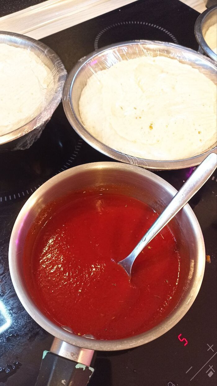 Соус подогрет, ждет. Можно заметить как поднялись порционные шарики теста в чашках. Ковш 1 литр, объем соуса примерно 200мл (на 2 пиццы)