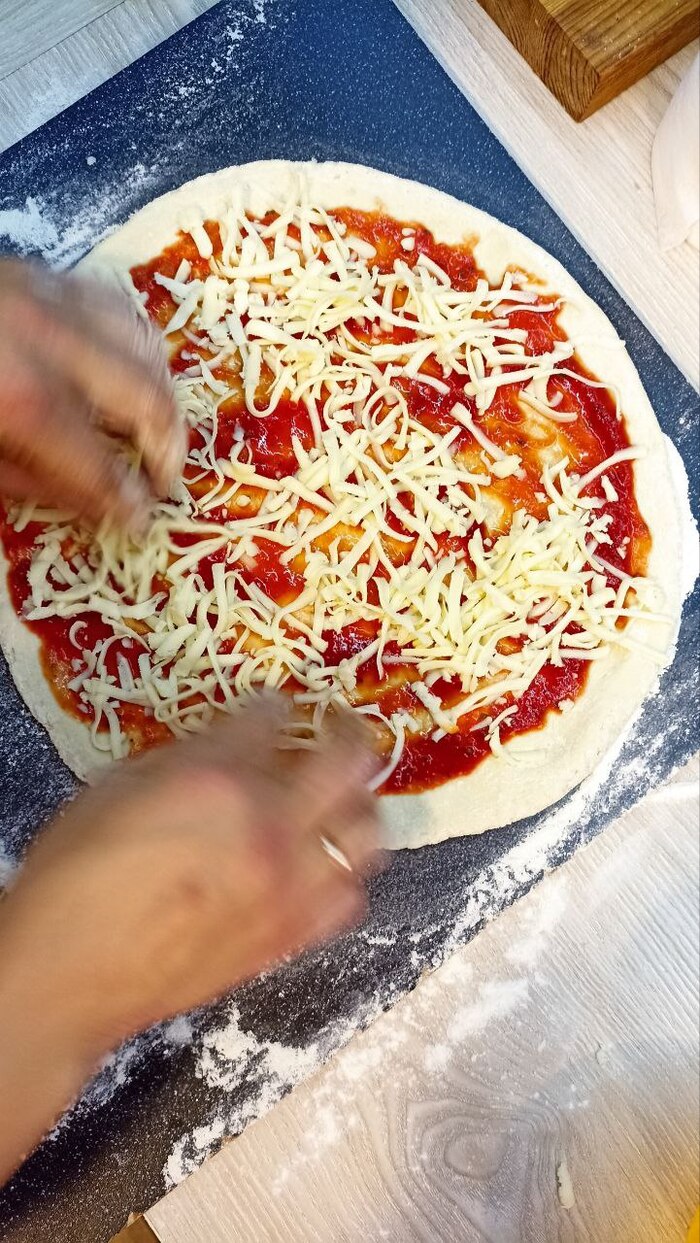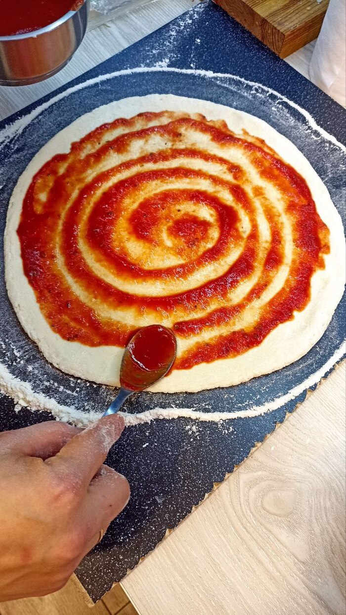 ВНИМАНИЕ! Если нет специальных прямых итальянских или профессиональных пиццных рук, а также специальной лопаты для пиццы - весь процесс делаем на поверхности, С КОТОРОЙ вы будете стряхивать пиццу в на поверхность (противень/камень) в духовке.