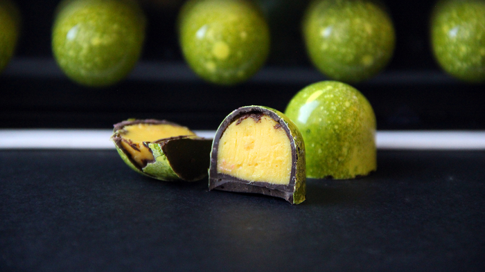 В сегодняшнем посте - корпус из темного французского шоколада и насыщенный манговый ганаш с приятной фруктовой кислинкой.