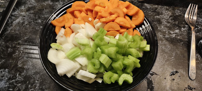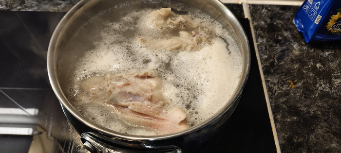 Ставлю вариться бульон в подсоленной воде. Варю из куриного супового набора. Шумовкой снимаю пену