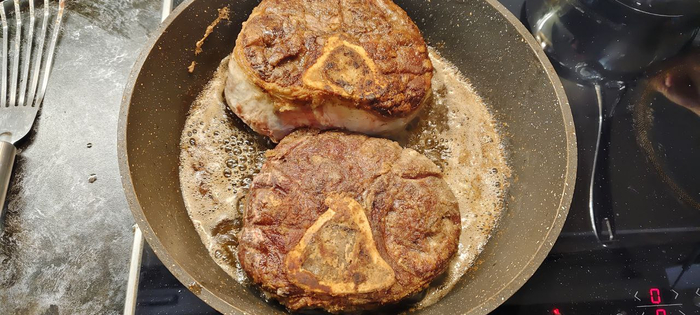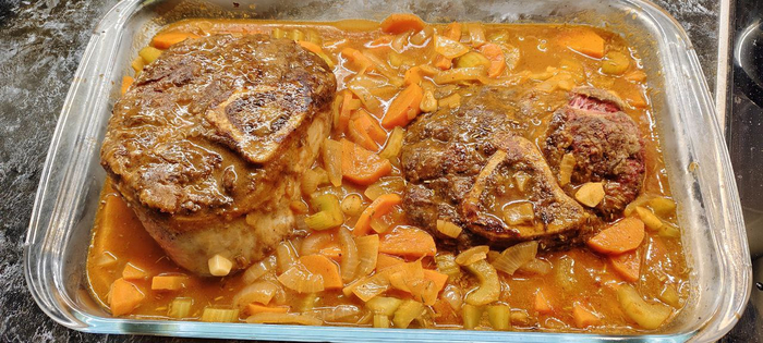 Оссобуко, оссо буко или осси-букки. Оссобуко означает буквально «полая кость» (от итал. osso — «кость» и buco — «дыра»), поскольку кость вместе с мозгом являются составной частью блюда. Тушёное мясо, для которого подходит один-единственный отруб — говяжья или телячья голяшка. Итальянская классика!