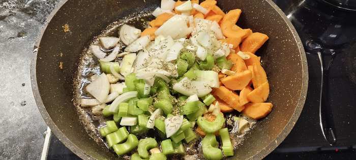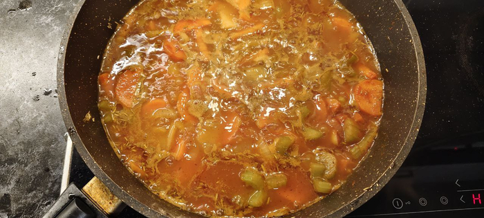 Вливаю отфильтрованный бульон. Тушу 10 минут.