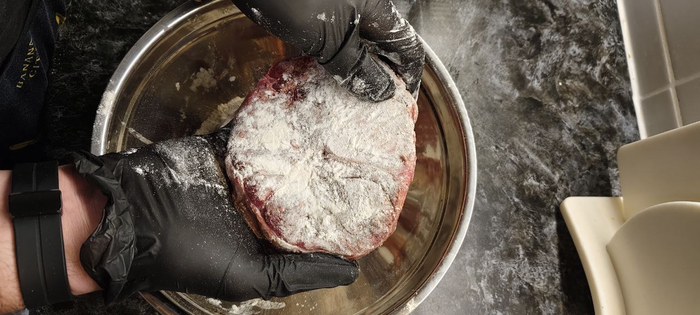 Мясо промываю. Вытираю бумажным полотенцем. Просыпаю смесью муки, соли и мускатного ореха.