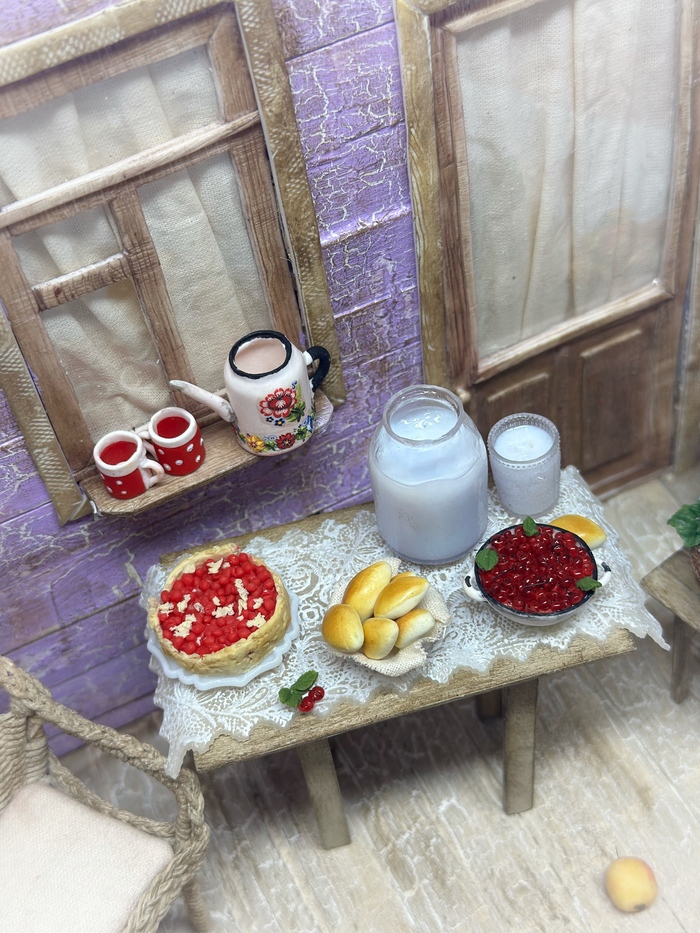 Плетёное кресло рядом ждёт невидимого хозяина. На столе выстроилась целая симфония летних даров: ягоды, выпечка, молоко, старый чайник. Все они выглядят так, словно их только что оставили, чтобы ненадолго забежать в дом и вернуться с ещё чем-то ароматным.