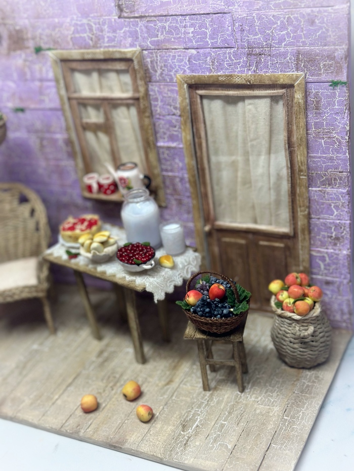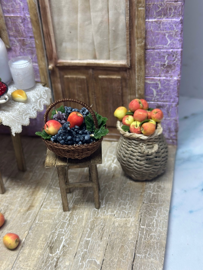 Корзина с фруктами и аккуратно сложенные яблоки рядом напоминают маленькие солнечные шарики — будто в этом месте лето никогда не заканчивается.