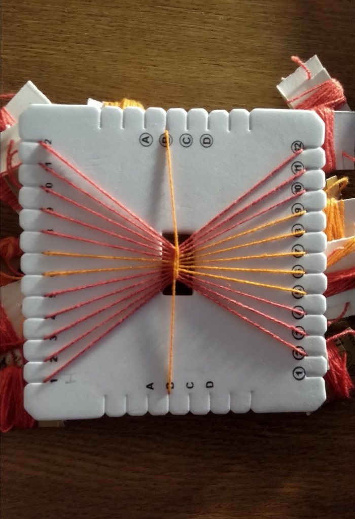 32 нити мулине по 8 метров каждая. 8 нитей на каждый из 4х цветов (Красный, Оранжевый, Синий и Белый).